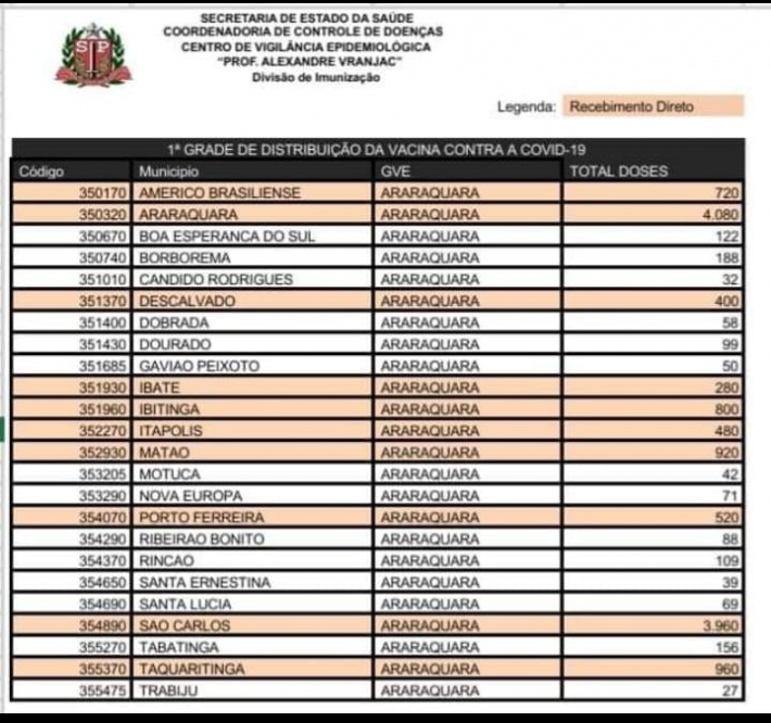 Na cidade de Américo Brasiliense, foram entregues 720 doses, Santa Lúcia (69), Rincão (109), Araraquara (4080) e Matão (920). Profissionais da saúde e políticos comemoraram com a chegada da vacina.