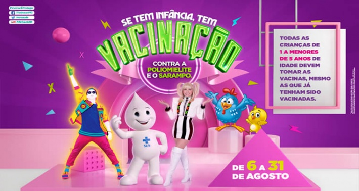 Para mobilizar a população, o Ministério da Saúde conta, neste ano, com o apoio da Xuxa, a eterna rainha dos baixinhos. Não é a primeira vez que ela é madrinha de uma campanha de vacinação do Ministério da Saúde. Nos anos 1980, Xuxa também estrelou uma campanha de vacinação que bateu recordes e foi reconhecida até pela Organização Mundial da Saúde (OMS). As peças para TV, rádio, impressos e redes sociais, serão exibidas de 1º a 31 de agosto. O filme, gravado em 3D, faz uma viagem ao passado, nas décadas de 80/90, quando nasceu o Zé Gotinha e também quando o Brasil assumiu o compromisso de eliminar o sarampo e a poliomielite. Xuxa e o Zé Gotinha contarão com o apoio da Galinha Pintadinha e dançarinos do game Just Dance.