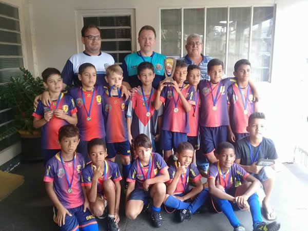 Ao lado dos professores, alunos da escolinha foram premiados em competições em 2017. (Foto: rede social/ prof. Jeferson Carlino)