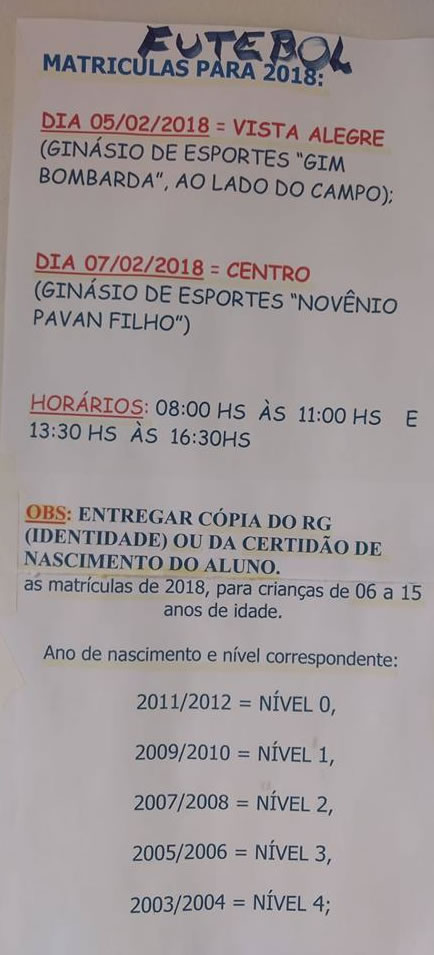 Para as aulas de futebol no campo do bairro Jardim Vista Alegre, as inscrições ocorreram durante todo o período desta segunda-feira. Já para os interessados em fazerem aulas no campo municipal, região central da cidade, as inscrições ocorrem na quarta-feira no período das 8 às 11 horas da manhã e das 13h30 às 16h30 no período da tarde, na secretaria de esportes.