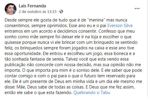 De acordo com o relato que está rendendo milhares de comentários em vários canais na internet, a mãe Laís Fernanda e o pai Everson Silva decidiram entrar em um acordo e consentiram na permissão de deixar a criança (filho) ser feliz, através dos brinquedos que gosta.