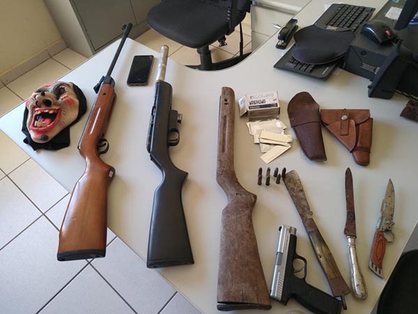 Na ação foram apreendidas armas de fogo, inclusive uma equipada com silenciador, além de facas, munição e uma máscara.