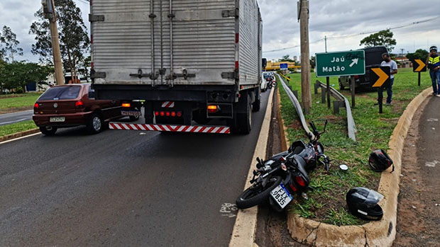 Moto atingiu a traseira de um caminhão que retornava em marcha à ré. O garupa sofreu ferimentos leves, foi socorrido e levado para o Hospital em Araraquara.