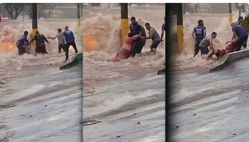 As vítimas estavam dentro de um veículo que ficou preso no alagamento, e a força da água chegou a encobrir quase todo o carro, que permanecia visível apenas pelas luzes.