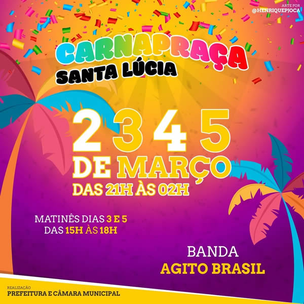 Organizado pela prefeitura Municipal de Santa (SP), o CarnaPraça 2019, evento realizado na Praça Matriz, no centro da cidade, começará no próximo sábado dia 02 com término na terça-feira, dia 05. Serão quatro noites de folia das 21 horas e término às 02 horas da manhã e duas matines, sendo uma no domingo e outra na terça-feira, das 15h às 18 horas. A animação ficará por conta da Banda Agita Brasil e também da professora Sheila Schiavo que pretende trazer coreografias de zumba, carnaval, axé e muito mais. A entrada é franca e os participantes deverão ficar atentos aos objetos que pode e o que não pode entrar no local.