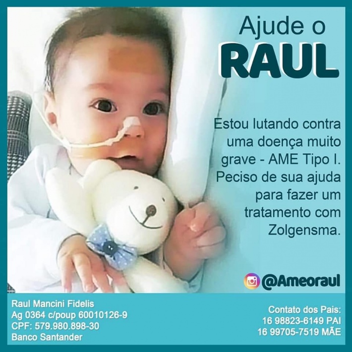 Moradores do Município de Santa Lúcia (SP), que são pais de um bebê que nasceu doente, estão organizaram uma campanha para arrecadar dinheiro para comprar um medicamento com o nome de Zolgensma, para ajudar no tratamento. Com idade de 4 meses, o bebê de nome Raul, nasceu com AME – Atrofia Muscular Espinhal. De acordo com médicos, não e existe cura, apenas um remédio muito caro, que barra o avanço da doença.