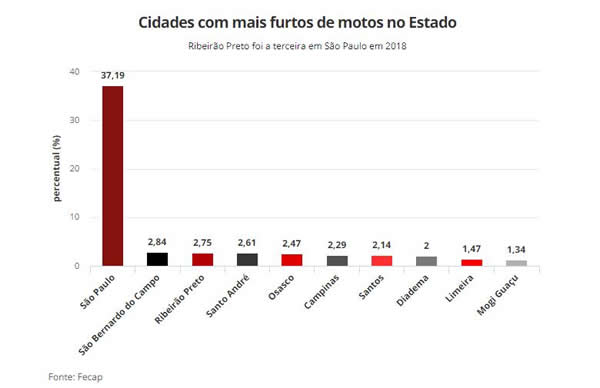De acordo com o estudo da fundação, feito com dados da transparência da Secretaria de Segurança Pública, o bairro com maior incidência de furtos de motos é o Centro, com 9%, seguido por Campos Elíseos e Jardim Paulista. As avenidas Capitão Salomão e Treze de Maio, além das ruas Bernardino de Campos, Antônio Fernandes Figueiroa e Praça Tônico Saiad são os endereços preferidos dos ladrões.