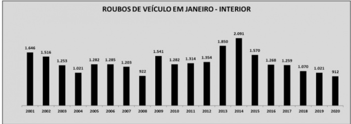 Todos as modalidades de furtos diminuíram em janeiro e tiveram as menores quantidades se analisada a série histórica. Os furtos em geral reduziram 11,6%, passando de 21.844 para 19.309 – 2.535 ocorrências a menos. Nos furtos de veículo a queda foi de 2,2%, com uma diferença de 61 boletins – passaram de 2.766 para 2.705.