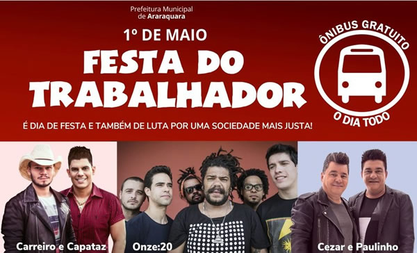 Muitos shows e atividades para todos os gostos e idades. Assim será o feriado de 1º de maio, Dia do Trabalhador em Araraquara. A atividade, realizada pela Prefeitura em parceria com as Centrais Sindicais, começa às 13 horas, na Praça Scalamandré Sobrinho (em frente à Arena da Fonte) com apresentações de bandas Pratas da Casa, pipoca, algodão doce, aula de zumba, gincanas e Feira de Economia Criativa e Solidária.