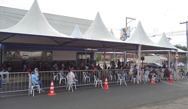 Para levar um pouco mais de conforto para as pessoas que ficam muito tempo na fila da Caixa Econômica, para recebimento do auxilio emergencial, prefeitura colocou tendas