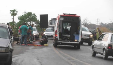 Após chuvisqueiro e pista molhada próximo da Iesa, motociclista ficou ferida e teve que ser socorrida pelo SAMU. Rodovia ficou paralisada.